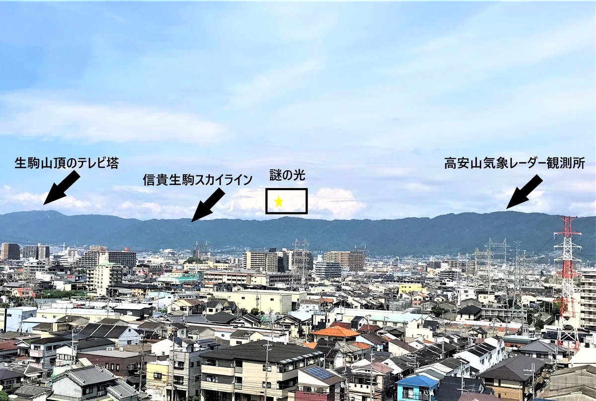 山のてっぺんにそれらしき物って言えば、高安山気象レーダー観測所の白くて丸い建物なんだけど、夜に光ってるの見た事無いし、この場所はもっと南側に位置する